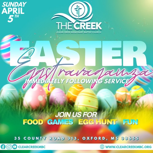 Come celebrate the Risen King and praise Him for dying on the cross so that our souls can be saved! Join us for Resurrection Sunday at the Creek. Sunday School begins at 9:30 a.m. and services will begin at 10:45 a.m. Gather the family and invite friends to come worship and fellowship together. We're looking forward to an amazing time in the Lord.